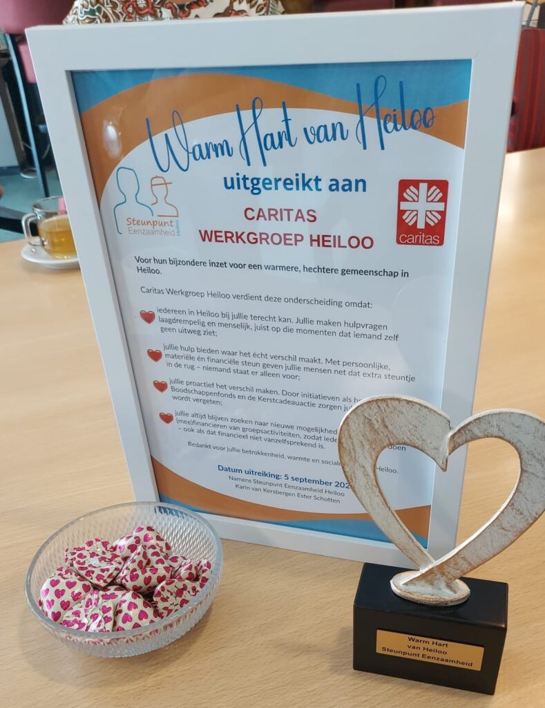 Op vrijdag 5 september mocht Caritas de ‘Warm hart van Heiloo’-trofee in ontvangst nemen. Een blijk van dank, maar vooral een uitnodiging aan ons allemaal: laten we blijven uitzien naar elkaar. Want eenzaamheid doorbreek je niet alleen met woorden, maar met daden. Klein of groot, altijd met een warm hart.